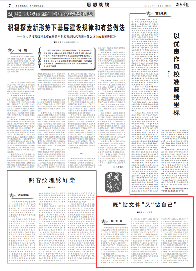 延安时期全党大学习有一条重要经验,就是“自己钻文件,又用文件钻自己”。“钻文件”,即沉下心来原原本本学、认认真真学、反反复复学理论;“钻自己”,则是要把自己摆进去,用理论指导实践。脱离实践的理论学习,终究是纸上谈兵;没有理论指导的实践,常常是盲目蛮干。唯有将二者紧密结合、一体推进,在深学细悟中强基固本,在知行合一中担当笃行,才能让理论学习真正成为干事创业的思想动力和行动指引。这一宝贵经验历经岁月沉淀,至今仍有着重要借鉴意义。