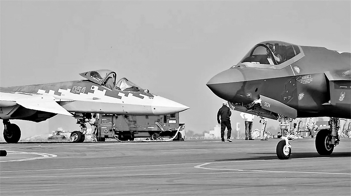 2025年印度航展上,美俄两型五代机苏-57和F-35首次同台亮相。资料图片