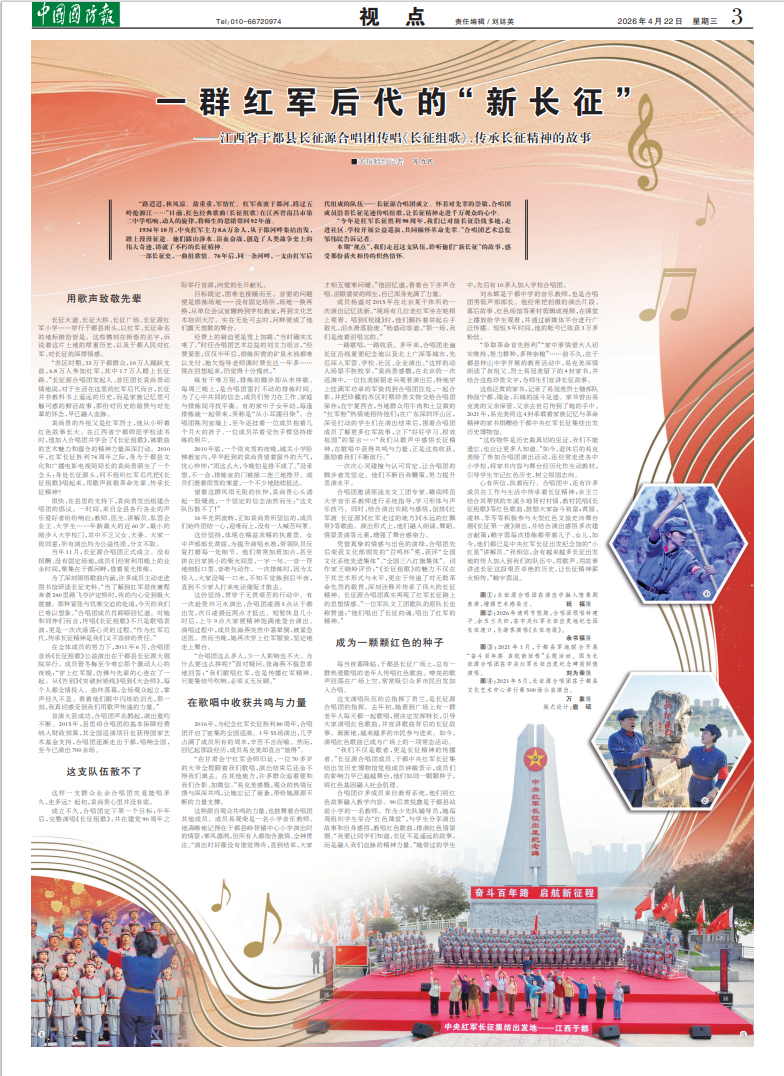 心有所信,执着而行。合唱团中,还有许多成员在工作与生活中传承着长征精神:余玉兰结合其帮扶的车溪乡坳背村村情,教村民唱《长征组歌》等红色歌曲,鼓励大家奋斗致富;黄丽、凌林、李芳等积极参与大型红色文旅史诗舞台剧《长征第一渡》演出,并结合演出感悟多次建言献策;赖宇蓉每次排练都带着儿子、女儿,如今,他们都已是中央红军长征出发纪念馆的“小红星”讲解员。“我相信,会有越来越多长征出发地的传人加入到我们的队伍中,用歌声、用故事讲述长征这段艰苦卓绝的历史,让长征精神薪火相传。”赖宇蓉说。
