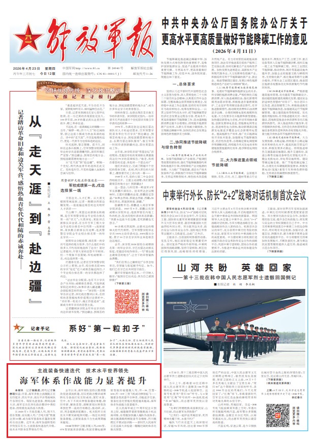 在人民海军成立77周年纪念日到来之际,福建舰带着新型舰载战斗机出海训练,东莞舰加快融入编队作战体系,湖北舰满载两栖装备专攻精练,四川舰跨区开展试验训练……新时代人民海军正在远海大洋绘就一幅幅壮阔的体系化练兵图景。