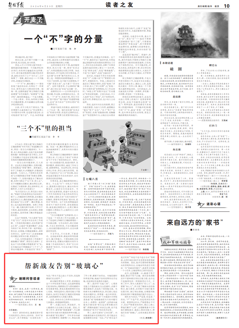 部队有句老话:“严是爱,松是害。”然而,“严”不是严苛,而是更深层次的关爱。要想带出好兵,严格管理必不可少,但在严格要求的同时,要以心换心帮他们解开“心结”,在理解尊重中引导他们磨炼意志、提高心理承受能力,帮他们告别“玻璃心”,在将来遇见更好的自己。