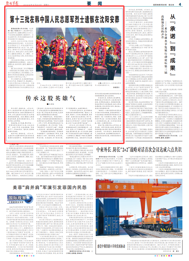 4月23日,是人民海军77岁生日。昔乘孤舸巡边岸,今驭巨艨镇大洋。4月24日,是第11个“中国航天日”。七秩问天路,携手探九霄,每一次飞天壮举,都刷新了中华民族进军太空的“中国高度”;每一次梦圆九天,都振奋了中国人民勇攀科技高峰的雄心壮志。这恰是对12位志愿军烈士英灵安息祖国大地的深情告慰:你们的英雄故事,我们正在续写。