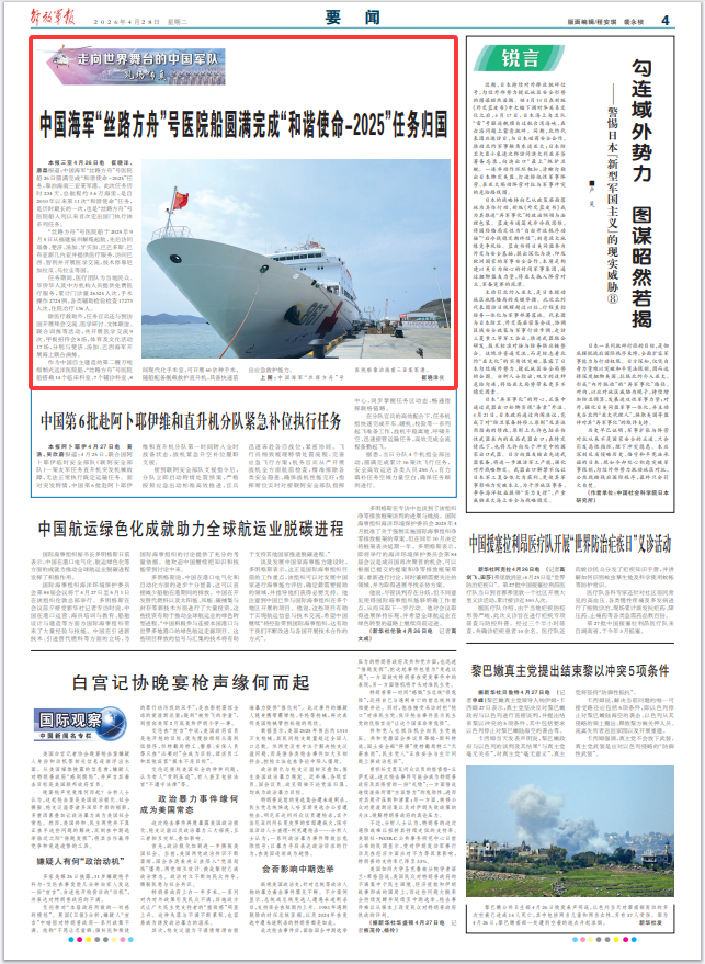 解放军报三亚4月26日电 崔晓洋、唐磊报道:中国海军“丝路方舟”号医院船26日圆满完成“和谐使命-2025”任务,靠泊海南三亚某军港。此次任务历时234天,总航程约3.6万海里,是自2010年以来第11次“和谐使命”任务,是历时最长的一次,也是“丝路方舟”号医院船入列以来首次走出国门执行该系列任务。