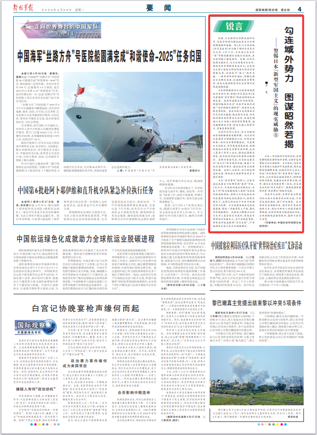 近期,日本持续对外释放挑衅信号,勾结外部势力搅乱地区安全形势的图谋昭然若揭。继4月10日在新版《外交蓝皮书》中大幅下调对华关系定位之后,4月17日,日本海上自卫队“雷”号驱逐舰擅自过航台湾海峡,在台海问题上蓄意挑衅。同期,北约代表团应邀访日,与日本磋商安全合作,推动北约军事触角东进亚太;日本防卫大臣小泉进次郎访问澳大利亚并签署备忘录,向澳出口“最上”级护卫舰。一连串动作环环相扣,清晰勾勒出日本绑定美盟、打造排他性军事阵营、在亚太煽动阵营对抗与军事冲突的危险路线图。