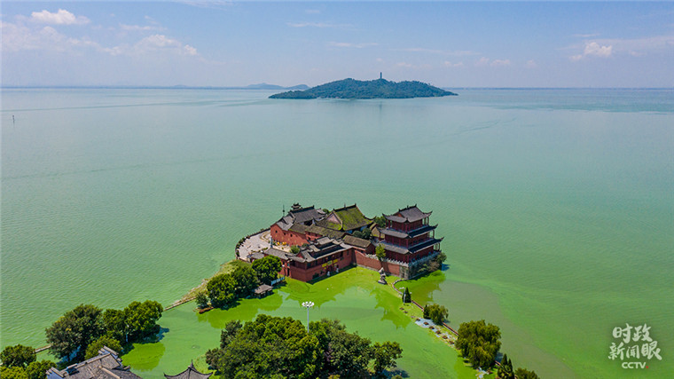 △7月份巢湖遭遇特大暴雨,位于北岸的中庙寺下方基座被淹,俯瞰如“湖中船”。