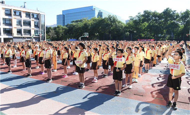 9月1日,在北京第二实验小学新文化街校区,五年级和六年级学生参加升旗仪式。新华社记者 任超 摄