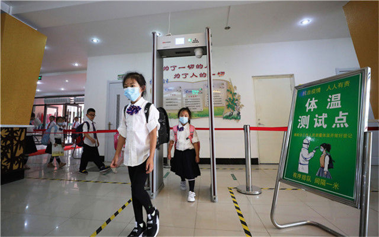 9月1日,在沈阳市于洪区花城学校,同学们在教学楼入口进行体温检测。新华社记者 杨青 摄