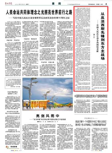 中国人民抗日战争是一场正义的民族解放战争,也是世界反法西斯战争的重要组成部分。中国战场是世界反法西斯战争的东方主战场。中国抗日战争为争取世界和平的伟大事业作出了彪炳史册的历史性贡献。正如1939年1月毛泽东在为《论持久战》英译本所作序言中指出:“伟大的中国抗战,不但是中国的事,东方的事,也是世界的事……我们的敌人是世界性的敌人,中国的抗战是世界性的抗战。”1941年7月,周恩来撰文指出,中国“久已成了东方反法西斯的先锋”。