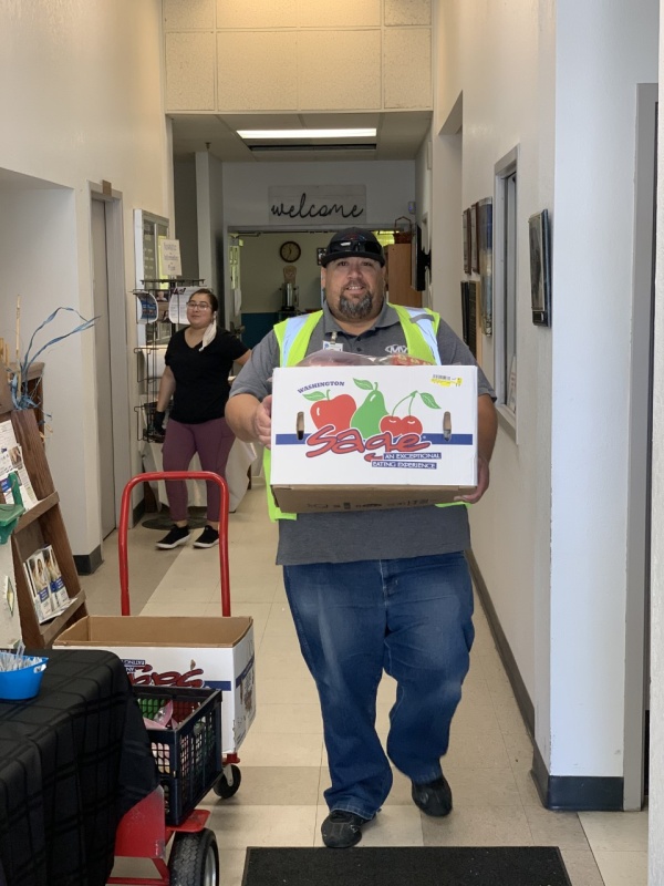 一名美国加利福尼亚州弗雷斯诺县农村交通局的公交司机为当地居民送去食品以及比亚迪提供的口罩和消毒液(2020年6月中旬摄)。新华社发(弗雷斯诺县农村交通局供图)