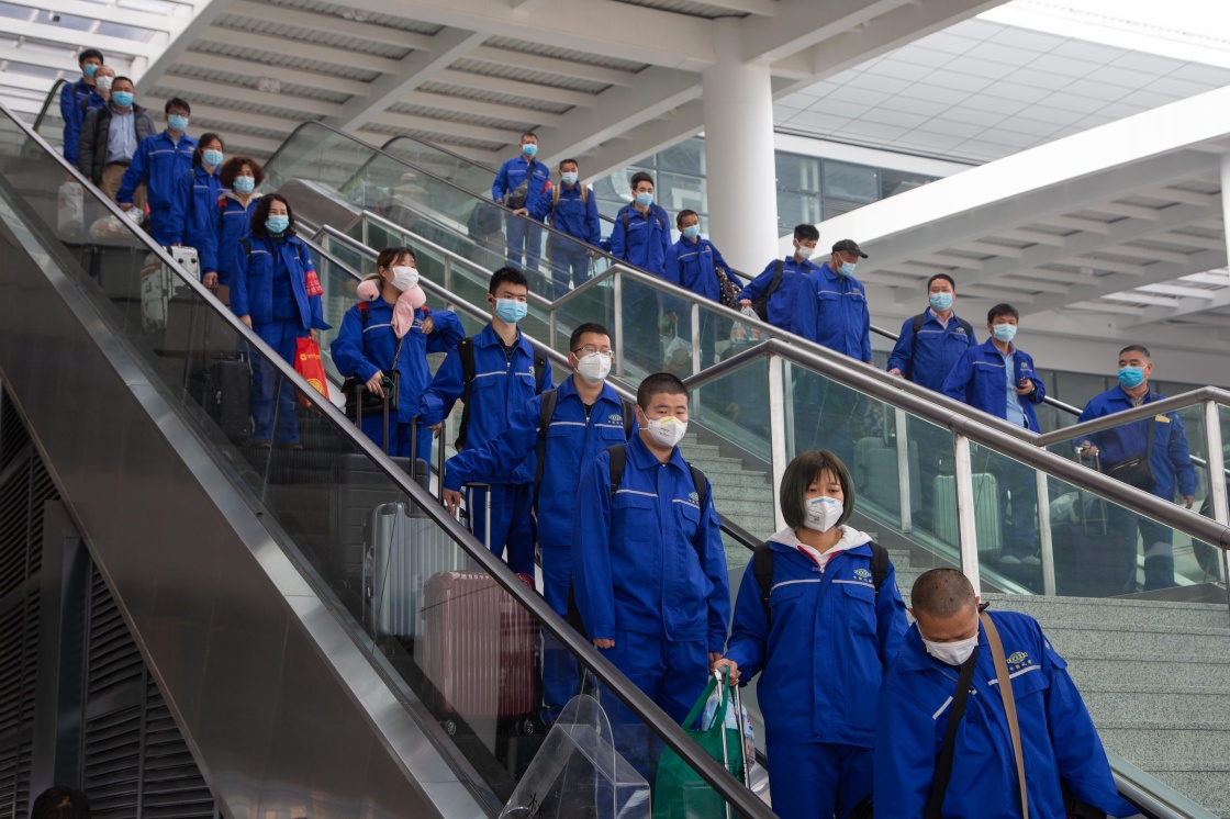 3月25日,由湖北襄阳开往烟台的G3228次务工专列从襄阳东高铁站发车,“点对点”输送中国化学工程第六建设有限公司520名员工前往山东返岗,助力企业复工复产。新华社发(杨东 摄)