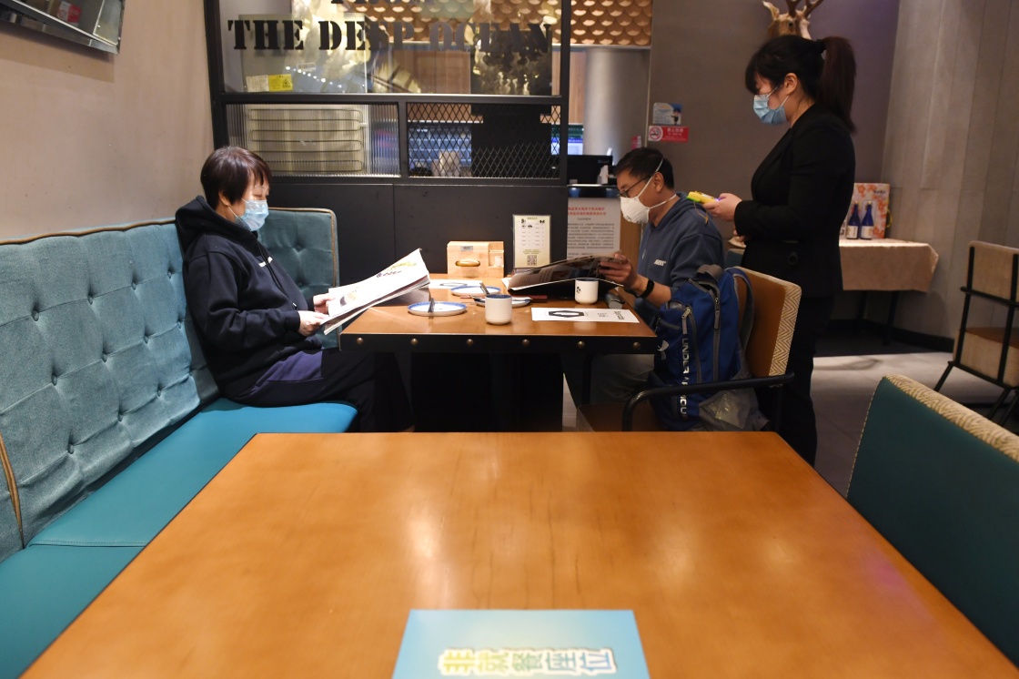 3月25日,在北京市朝阳大悦城一家餐厅内,两位顾客在点餐。记者在北京市朝阳大悦城商场看到,恢复堂食的餐厅采取了检测顾客体温、登记信息、提供消毒液、控制餐厅就餐人数、推行公筷公勺等多种防控措施,保证就餐者的安全与健康。新华社记者 鞠焕宗 摄