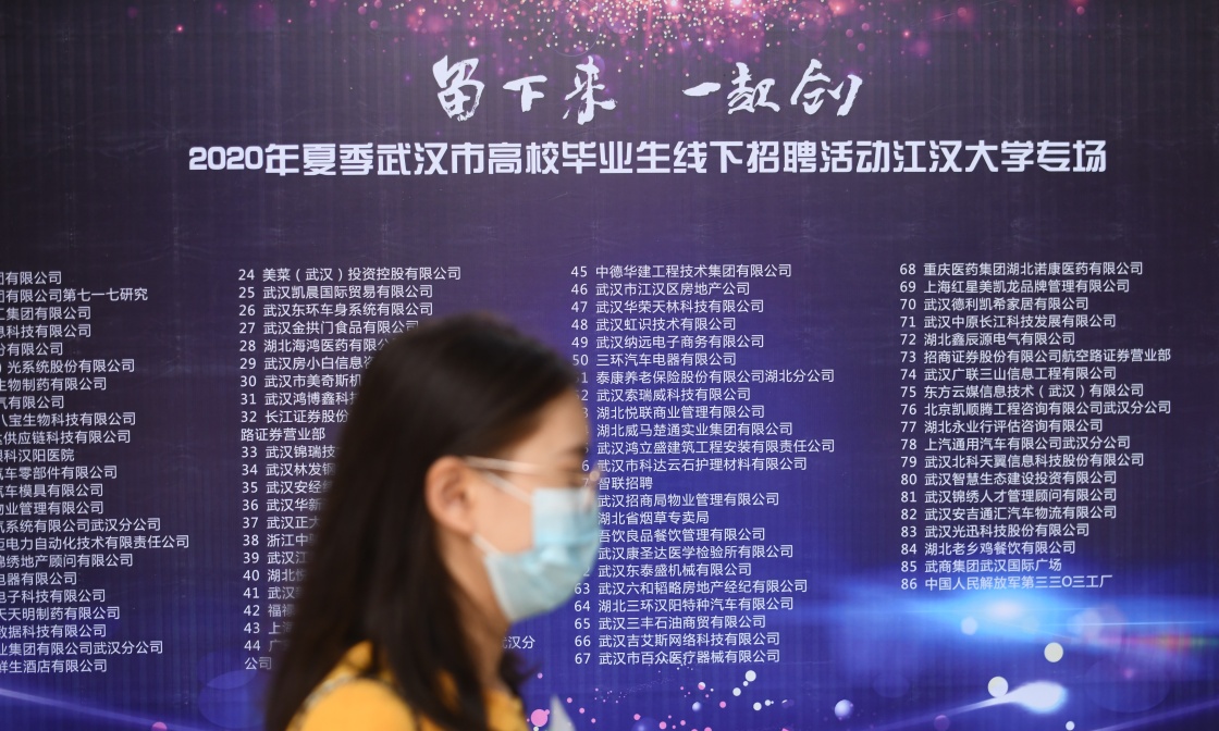 6月1日,在湖北武汉江汉大学,一位求职者从印着招聘企业名录的展板前走过。这是疫情发生后,武汉举办的首场高校毕业生专场线下招聘会。新华社记者 程敏 摄