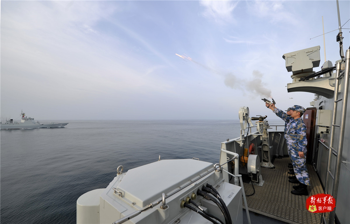 将“振华27”号护送到指定海域之后,两批护航编队组织了简短的分航仪式。