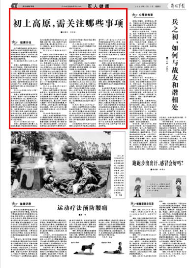 陈照立:官兵从平原到高原后,身体会受到不同程度的影响,其症状轻重、持续时间与海拔高度,进驻高原的速度、季节、活动量以及个体差异有关。海拔高度1500米以上,每升高1000米,作业能力(劳动能力)下降约10%;在海拔3000-4000米地区从事重体力劳动,相当于平原时的极重体力劳动;在海拔4000-4800米地区从事中等体力劳动,相当于平原时的重体力劳动;在海拔5000米以上地区从事轻体力劳动,相当于平原时的重或极重体力劳动。一般认为,高原劳动和平原劳动相差1-1.5个劳动强度等级,所以战友上高原后感觉体力下降。