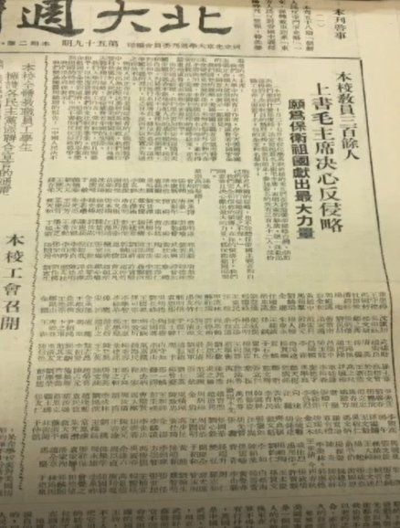 11月6日,北京大学发布《本校全体教职员工学生拥护各民主党派联合宣言的通电》,保证以各种积极有效的方式为抗美援朝保家卫国的神圣任务而奋斗。在北大档案馆有关抗美援朝的照片集中,有两张照片记录了当时北大教职员在现场签名拥护各民主党派联合宣言的真实场景:在北大反侵略委员会《抗美援朝保家卫国》宣传横幅的映衬下,每一位教职员的表情都是严肃而坚定的,怀着对新中国的热爱、对抗美援朝的支持而郑重签字。
