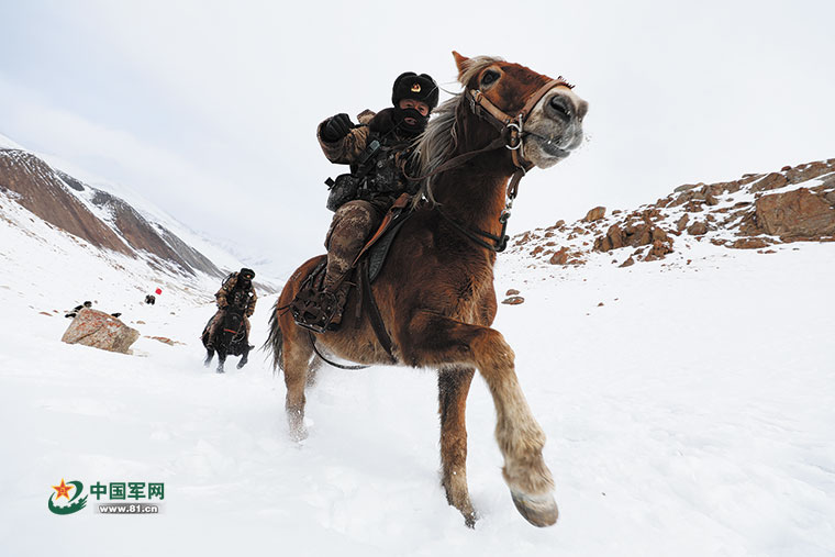 早饭过后,迎着凛冽的寒风,记者和巡逻分队的战士们骑着军马出发了。高原恶劣的自然环境总喜欢展示它无比残酷的威力,风一个劲地往脖领里钻,冷飕飕的。
