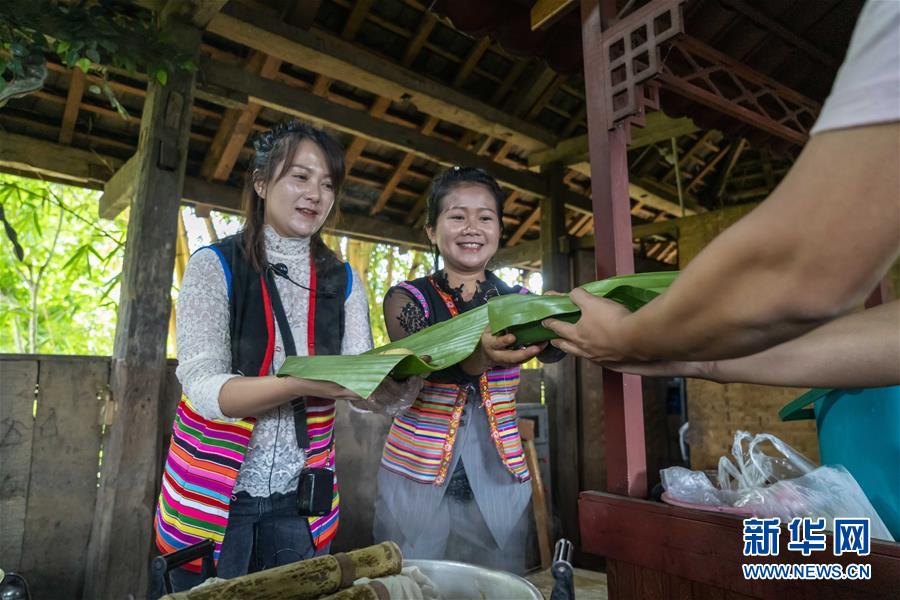 村民在基诺山寨内售卖基诺族传统小吃(8月13日摄)。 新华社发(陈欣波 摄)