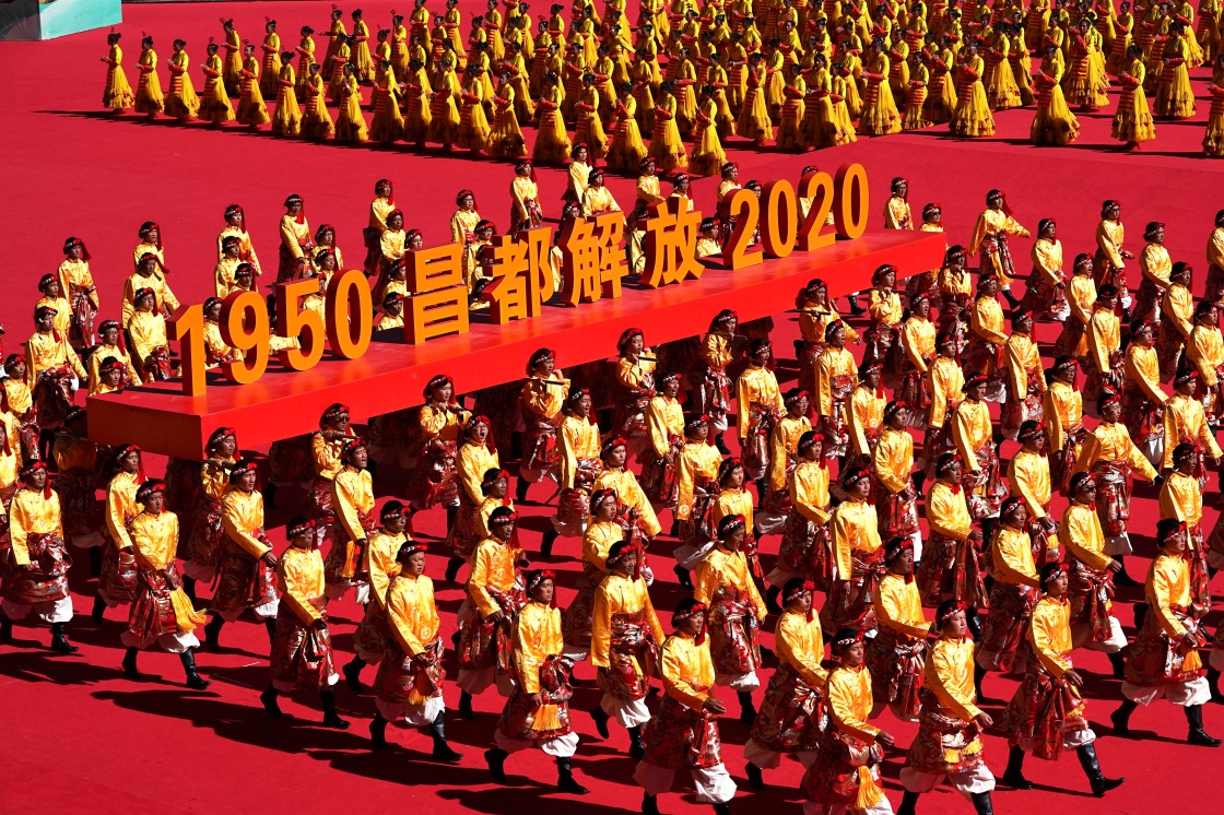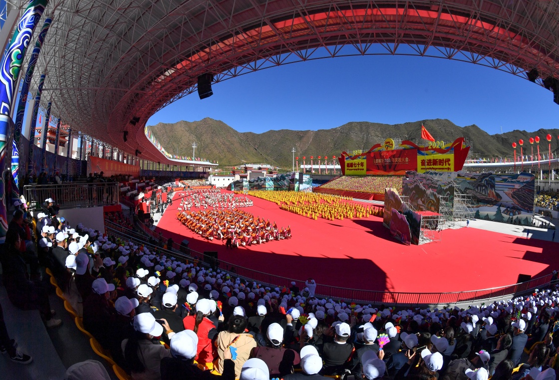 这是10月9日拍摄的西藏昌都解放70周年庆祝大会现场。当日,西藏昌都解放70周年庆祝大会在昌都市举行。新华社记者 詹彦 摄
