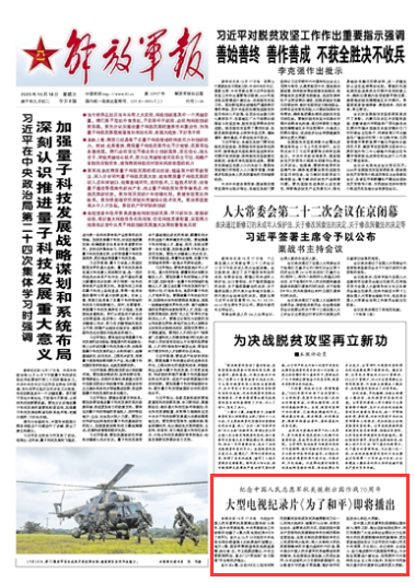 解放军报北京10月17日电 为纪念中国人民志愿军抗美援朝出国作战70周年,经中央军委批准,中央军委政治工作部组织拍摄了6集大型电视纪录片《为了和平》。该片从10月18日起在中央电视台综合频道晚8点档黄金时段播出,每天2集,国防军事频道等其他频道重播,部分省、区、市卫视跟进播出,中央主要新闻网站、重点门户网站和“学习强国”平台等同步推出。