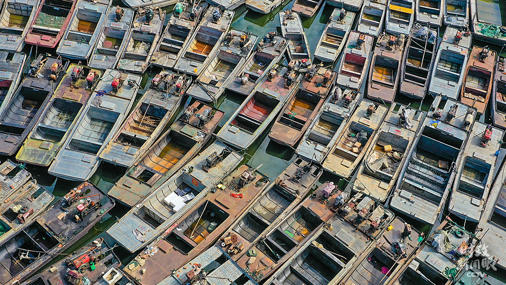 △国家实施长江流域禁捕退捕政策后,江苏宿迁泗洪县启动洪泽湖水域禁捕退捕和住家船整治工作。这是聚集在渔港等待拆解的渔船。
