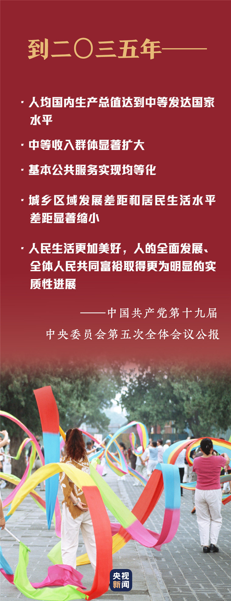 十九届五中全会提出到二〇三五年基本实现社会主义现代化远景目标。到那时,人民生活更加美好,人的全面发展、全体人民共同富裕取得更为明显的实质性进展。