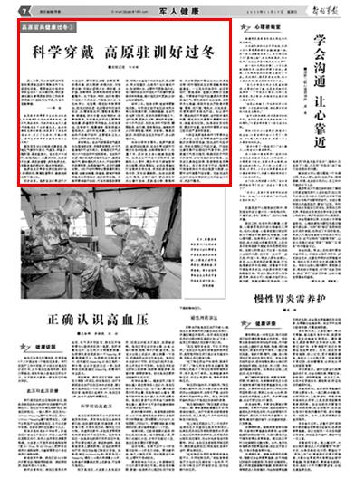 解放军第950医院院长谭彦宏:高原地区气候较为恶劣,气温低、积温少、光辐射强、昼夜温差大。官兵在户外训练时,体能消耗大、热量丧失快,如果穿着不注意,易受凉感冒,诱发高原反应,甚至罹患高原肺水肿、脑水肿等疾病。