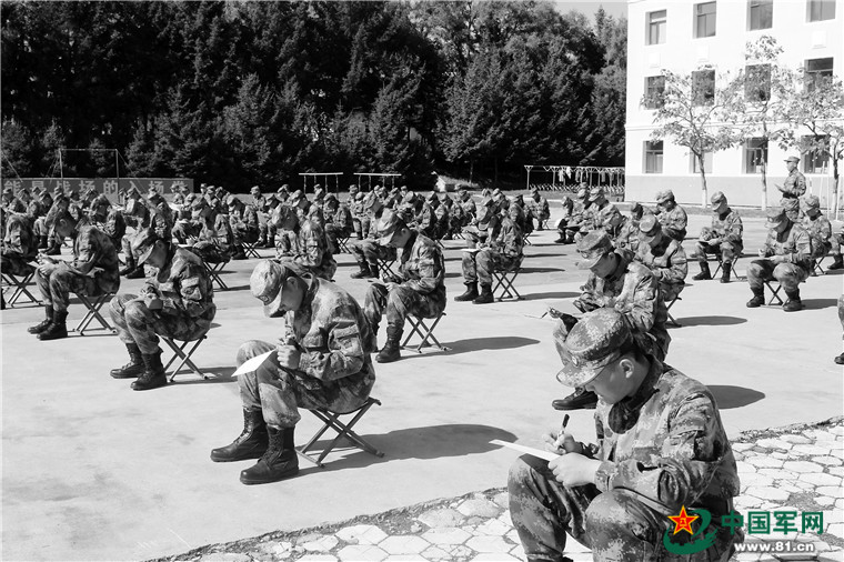 近日,第78集团军某旅新兵营组织新兵学习《中国人民解放军内务条令(试行)》,并组织条令常识考核。庄新鹏摄