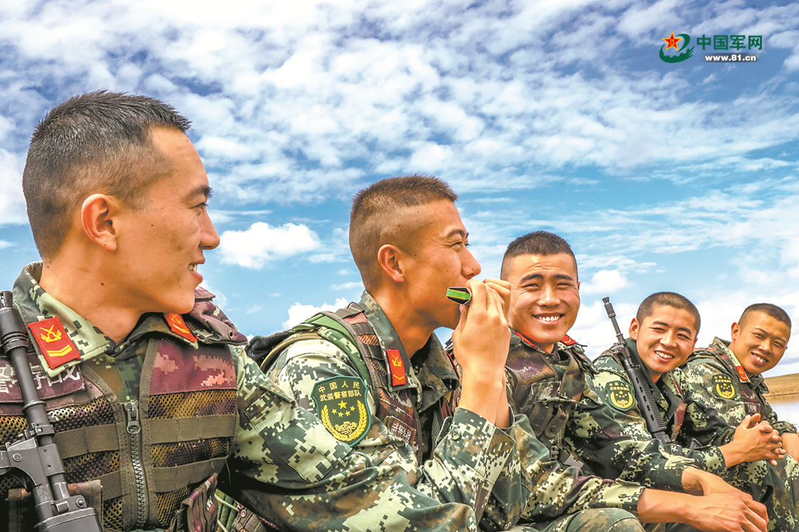 休整时,下士赵发(左二)吹奏口琴为战友们缓解压力。