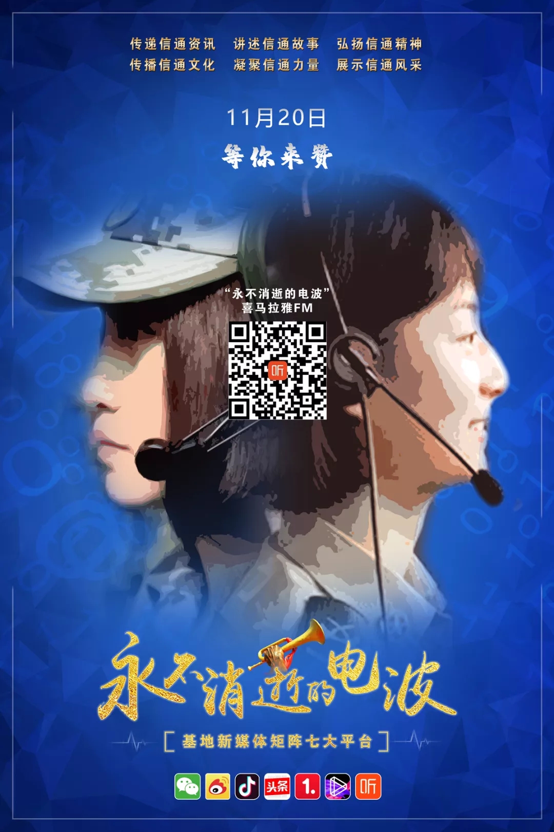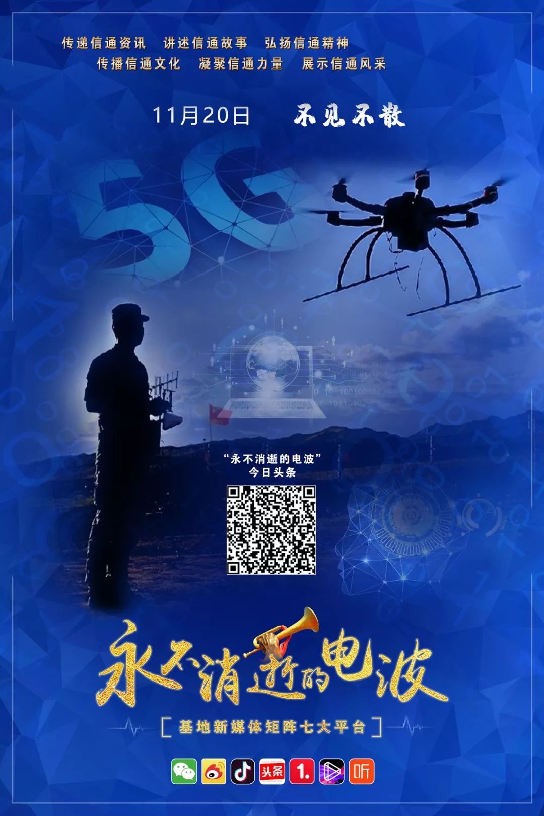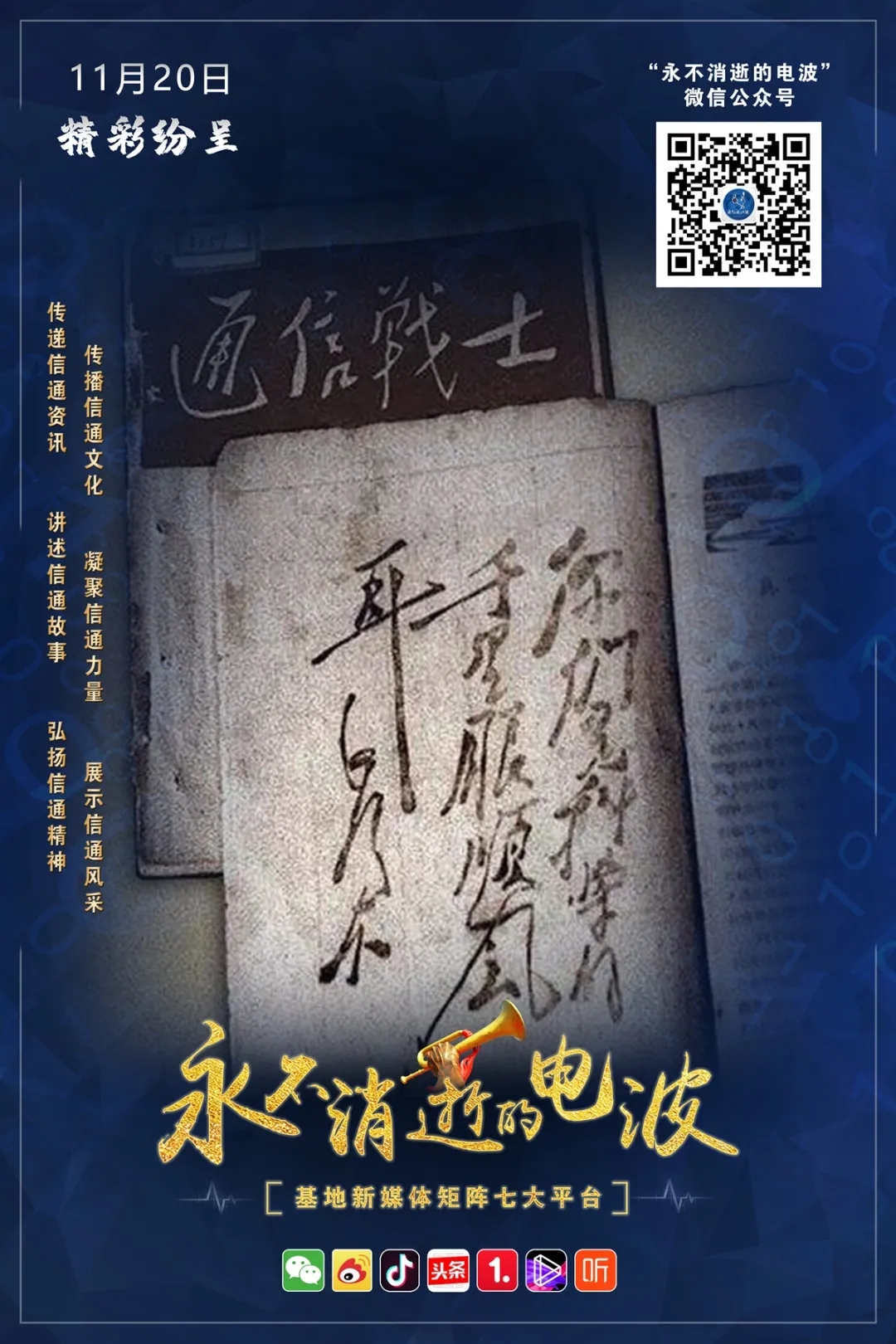 今天,我们在七大新媒体平台传承红色基因,赓续信通血脉,讲述咱通信兵自己的故事,让电波永不消逝。