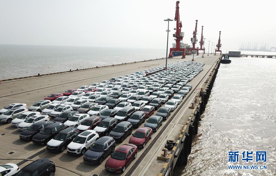 在位于上海临港的上海南港码头,新出厂的汽车等待装船转运(2019年6月27日摄,无人机照片)。新华社记者 方喆 摄