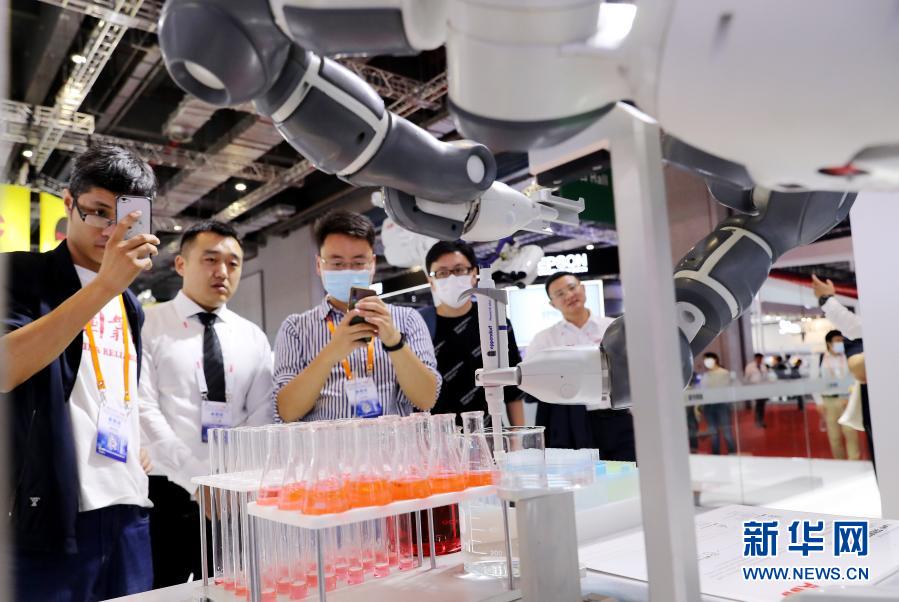 参观者在上海举行的第二十二届中国国际工业博览会上的一个实验室预处理单元前驻足观看(9月15日摄)。新华社记者 方喆 摄