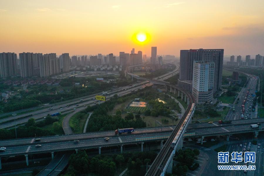 列车行驶在上海轨道交通11号线北段延伸工程花桥段(上海安亭站至昆山花桥站)兆丰路站附近(8月21日摄,无人机照片)。新华社记者 季春鹏 摄