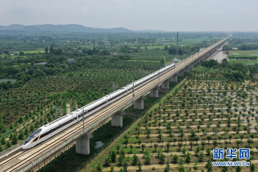 列车在商合杭高铁浙江安吉县境内行驶(6月28日摄,无人机照片)。新华社记者 黄宗治 摄