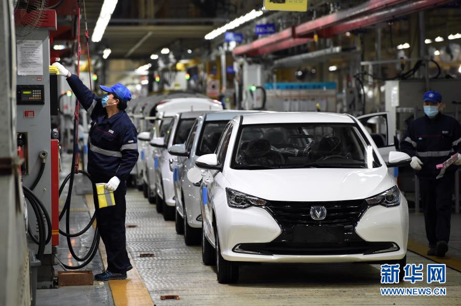 工人在合肥市高新技术产业开发区合肥长安汽车有限公司车间内忙碌(2月26日摄)。新华社记者 周牧 摄