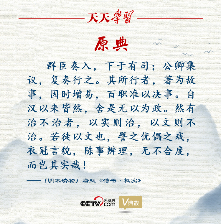 “以实则治,以文则不治”出自明末清初思想家唐甄所著的《潜书》。唐甄不仅是一位杰出的思想家,也是一位成功的实践者。他在山西长子县做知县时,为了动员百姓种桑养蚕,不但挨家挨户做说服工作,而且带头示范。结果没有发布一纸文书通告,百姓就在一个月内种桑80万株。他的成功经验便是“为政贵在行”,“行”,就是落实。唐甄认为,文书通告只是“藉以通言语,备遗忘耳”,故而提出“以实则治,以文则不治”。唐甄的这一观点,主要是针对当时官场中公文泛滥、有令不行的弊端提出的,并非一概否定发布文告推行政令的作用。