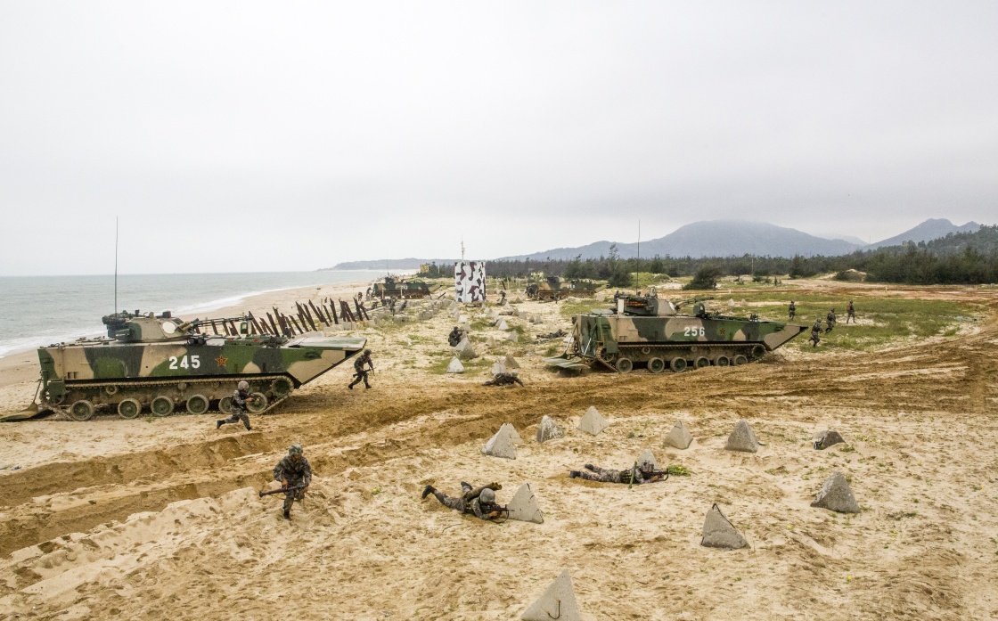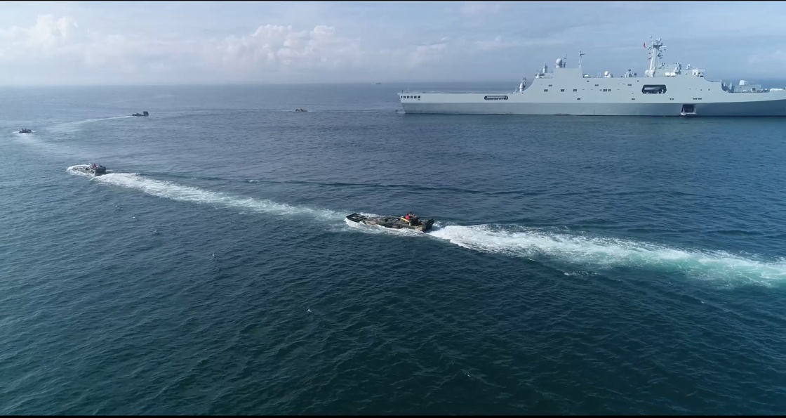 陆军第72集团军某旅组织海上驾驶训练,战车按协同队形依次驶上海军登陆舰(2018年8月16日摄,无人机照片)。新华社发(庄林毅 摄)