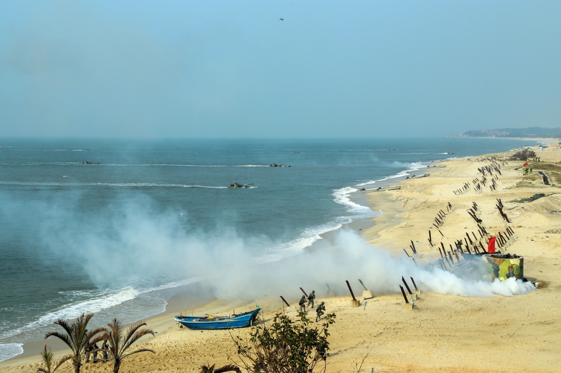 陆军第72集团军某旅组织陆空一体实兵演练,蓝军投放烟雾弹干扰红军登陆(2017年8月20日摄)。新华社发(庄林毅 摄)