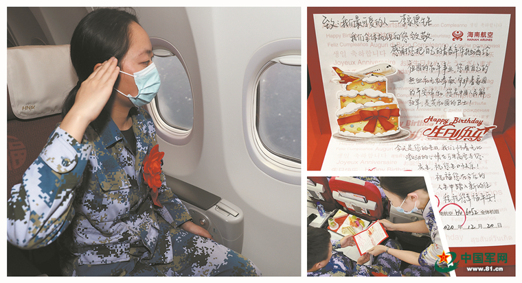 “亲爱的人民子弟兵们,今天是一名退伍老兵的生日,我们全体机组人员怀着激动的心情,在万米高空为他庆生……”飞机进入巡航阶段,机组广播突然响起樊雪松的声音。原来,这一天是老兵李家德的生日,机组专门为他策划了一个特殊的生日仪式。同为退伍军人的乘务员李陈杨子,提前精心制作了生日贺卡(图③)和可口餐食,让李家德非常惊喜。