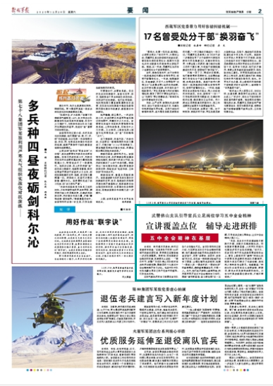 这样气氛热烈的学习场景在该支队各个点位随处可见。该支队领导向记者介绍,为加深官兵对五中全会精神的理解,他们遴选政治教员和先进典型作为宣讲骨干,采取“多群体、多层次、多场地”的方式,在任务一线和演训驻地开设学习课堂,让理论辅导走进班排,构建“一课多人讲、一课多次讲、一课多处讲”的教育模式,确保教育覆盖全员、不落一人。此外,他们还开辟线上教育阵地,利用强军网开设五中全会精神学习专栏,围绕“谱写新蓝图、奋斗新征程”这一主题,引导官兵交流心得体会,让五中全会精神入脑入心。
