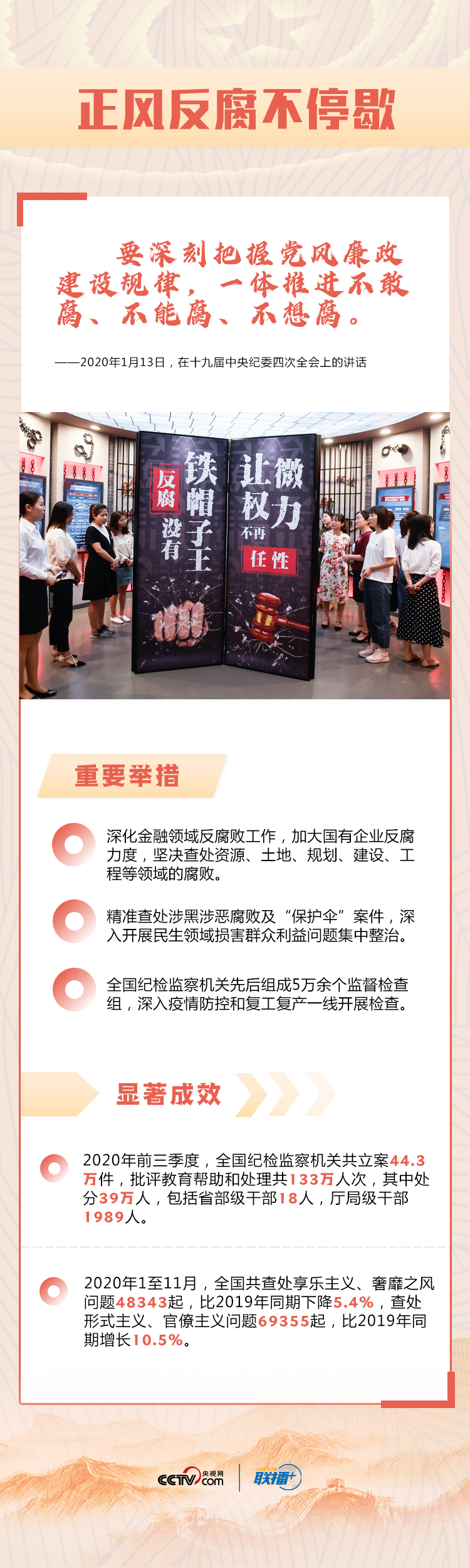 2020年党风廉政建设和反腐败斗争采取了哪些重要举措,取得了哪些显著成效,在全社会起到了什么样的示范作用?央视网《联播+》栏目特推出图解,与您一起了解。