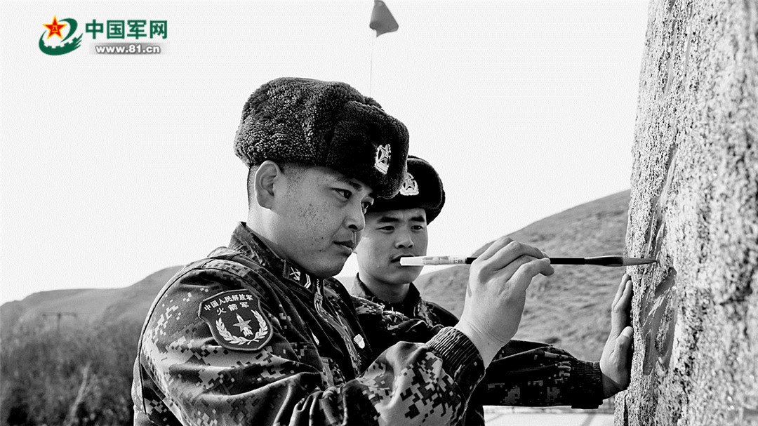 腊八节当天,田存良(左)和战友给哨所石碑描红;