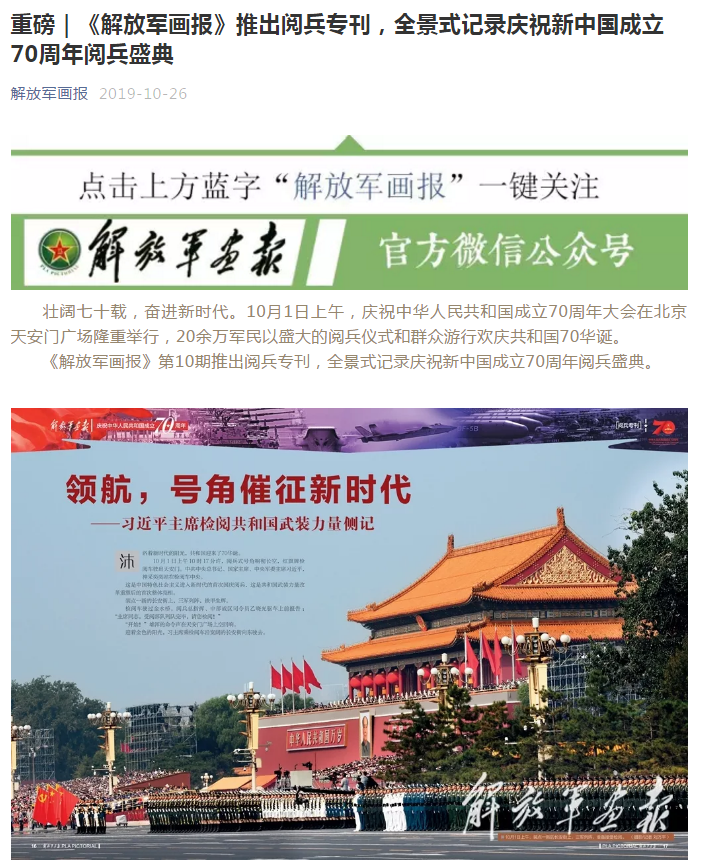 微信作品“阅兵专刊:全景式记录庆祝新中国成立70周年阅兵盛典”(“解放军画报”官方微信公众号2019年10月26日推送)