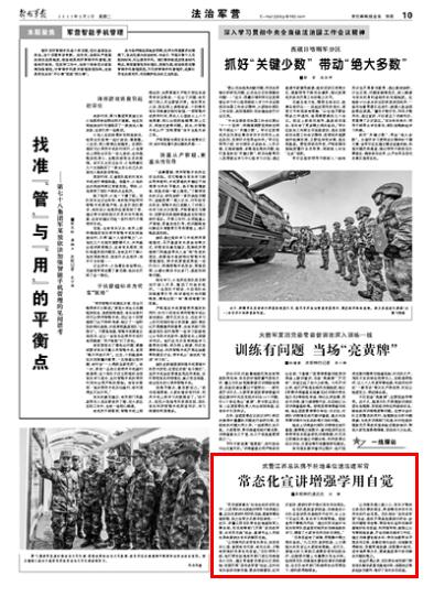 让法律法规入脑入心,官兵才能树立依法办事的观念,养成尊法学法守法用法的行动自觉。总队结合“送法进军营”活动,组织开展典型案例分析会、涉法问题咨询会等,帮助官兵运用法律武器维护合法权益;利用强军网、微信公众号等网络资源,开设法律法规学习专栏,建立法律援助服务站,使法治教育由平面走向立体、由静态转为动态、由抽象变得鲜活;发掘军地资源,采取集中培训、送学培养等方式,提高基层骨干依法解决问题的能力。