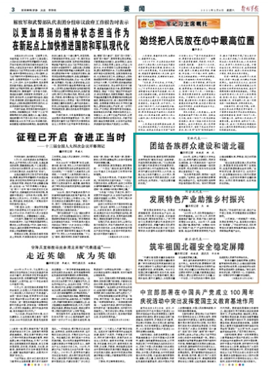 “要倍加珍惜、继续坚持民族团结光荣传统和‘模范自治区’崇高荣誉,巩固发展民族团结大局。”习主席在参加内蒙古代表团审议时的重要讲话,在宝林代表心中引起强烈共鸣,“我是来自内蒙古边防的军队人大代表,也是土生土长的内蒙古人,从小到大,我的身边有许多不同民族的朋友,大家共同生活、共同成长,一起见证着北疆的巨变。”