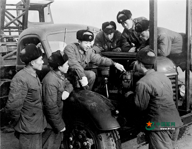 雷锋向战友介绍汽车节油的经验。