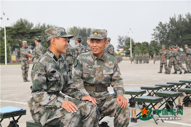 新兵四连指导员李团禄在训练场和新战士聊家常