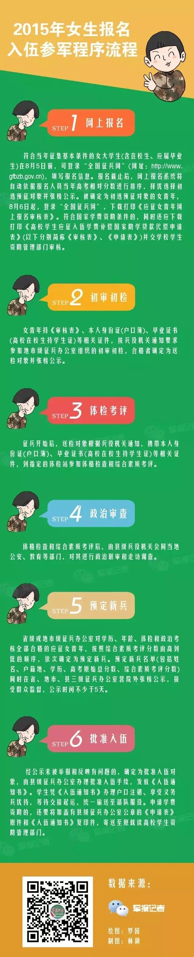 如果亲们不想看繁琐的文字,那么方法很简单,下面一张图让你对2015年女生报名入伍参军程序流程了如指掌。你可以下载下来保存使用。