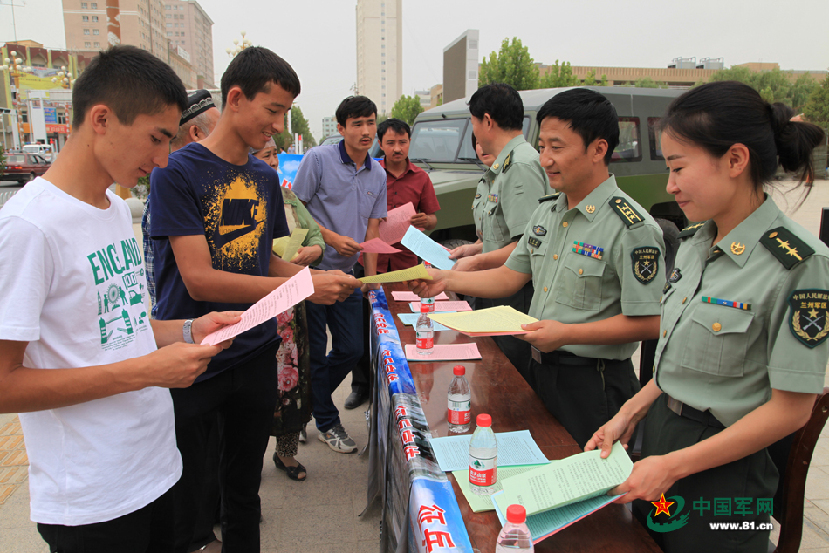 7月23日,驻守在帕米尔山脚下的新疆维吾尔自治区阿图什市人武部通过邀请优秀现役和退役士兵讲述自己的军营故事、解读大学生应征入伍优抚优待政策法规、印发维汉宣传册、播放征兵广播等措施,积极调动少数民族地区优秀青年应征入伍的积极性。刘慎摄