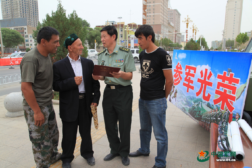 阿图什市人武部政委宋亮向前来了解征兵政策的驻地群众解答疑惑。
