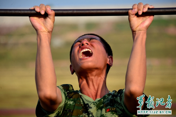 单杠引体向上。一名新战士一声怒吼,超越自我。
